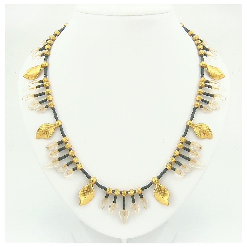 Joli collier style plastron, les éléments décoratifs forme de feuilles sont en métal doré de haute qualité qui ne s'oxydent pas. Pierre cristal de roche et petites perles de lave. Le quartz est un outil de rechargement. C'est une pierre maitresse en lithothérapie ... La pierre de lave est une roche naturelle, scorie volcanique ...
